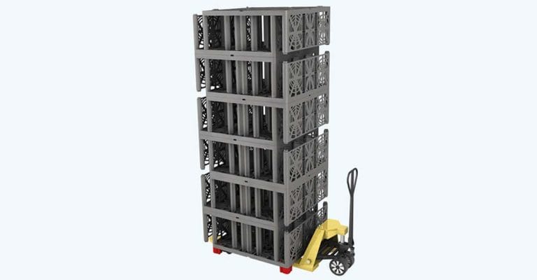 - Économique et écologique, il pèse 7 kg pour un volume de 225 Litres avec une superficie de 800 x 800 et une hauteur de 350 mm. Sa conception permet de transporter jusqu’à 475 m³ dans un seul camion. Cela diminue de 85% les coûts de transport et ainsi l’émission de CO2.