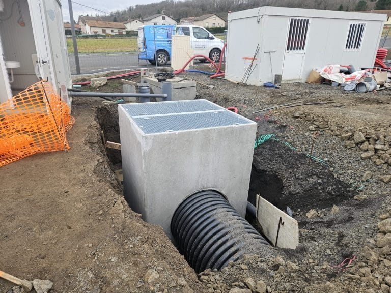 Sur ce chantier situé dans le 63, l’enjeu était de sécuriser l’évacuation des eaux d’une grande surface de matériaux de construction. Voici les détails techniques de la solution mise en place :